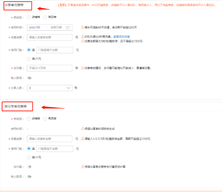 裂变劵的设置方式和其他的劵并没有什么不同,唯一的不同就是设置的是两种劵,和设置分享几个人才能得到这张优惠券的门槛。