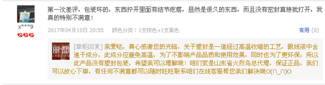 看图4说话,顾客针对眼线笔不满意,卖家的解释里没有提出任何解决方案,也没有告知可以办理退货。然后就草草的结束了。